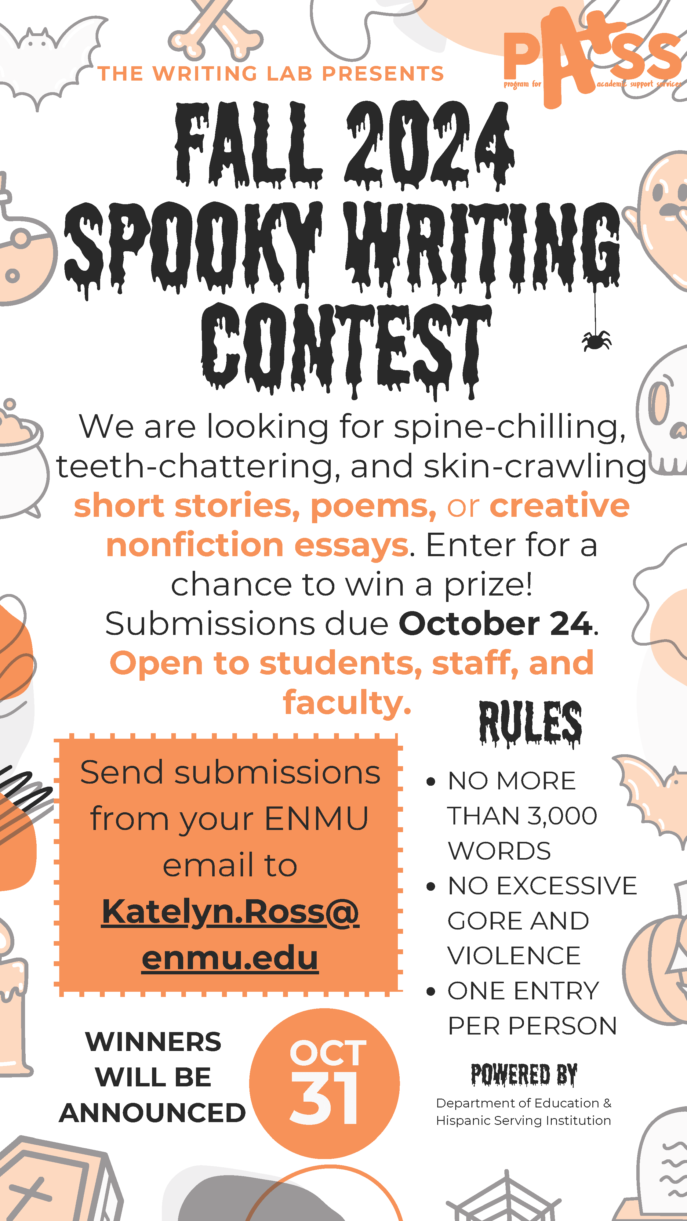 We are looking for spine-chilling, teeth-chattering, and skin-crawling short stories, poems, or creative nonfiction essays. Enter for a chance to win a prize! Submissions due October 24. Open to students, staff, and faculty.
