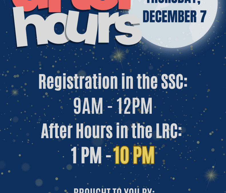 Thursday, December 7th, 1 PM to 10 PM In collaboration with with Student Support Services (TRiO) and theProgram for Academic Support Services (PASS), we will be hosting an evening study session that will include games and food throughout the night. Keep checking back...