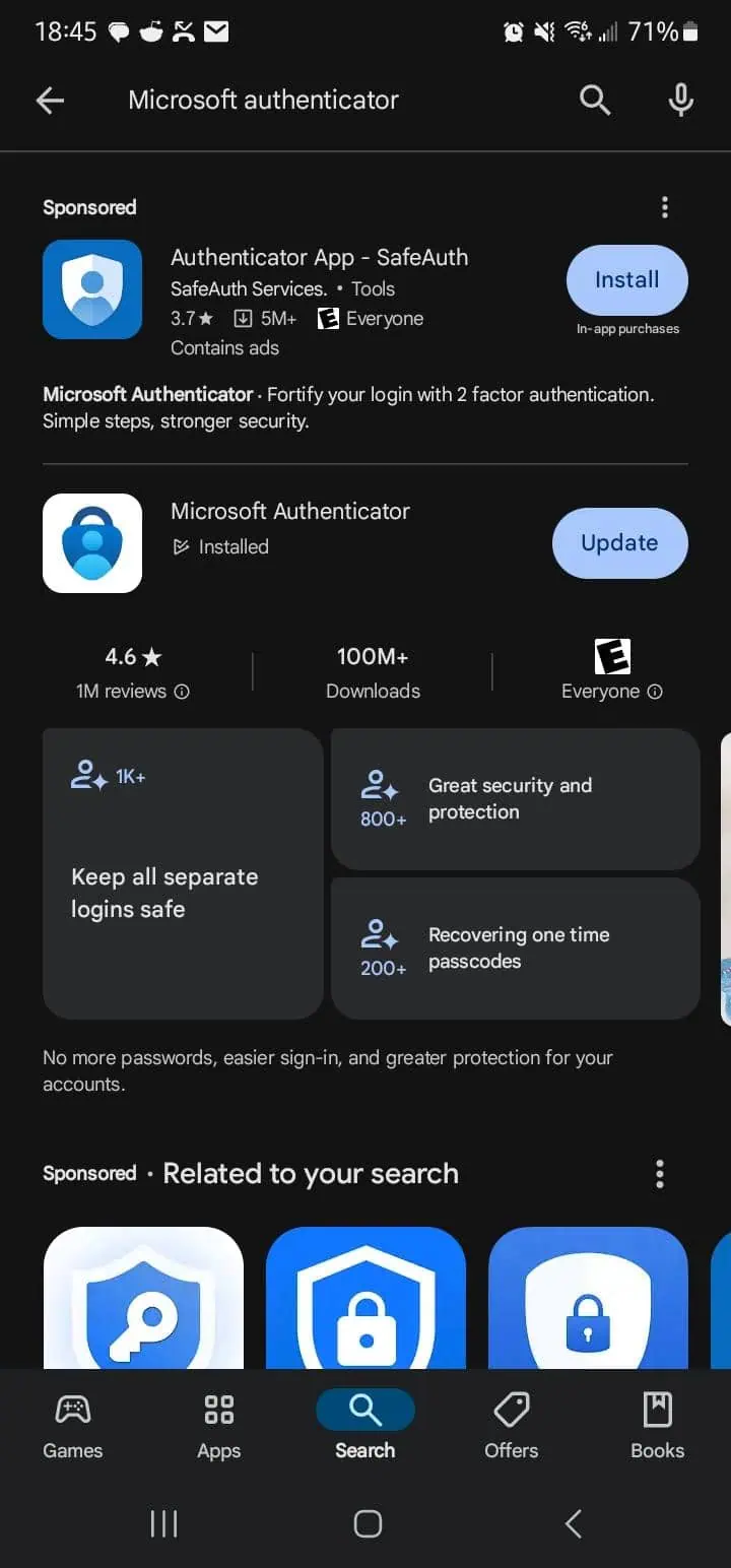 In both the Apple App Store and the Google Play Store, you may encounter an app that looks very similar to the Microsoft Authenticator at the top of your search results. This is an Ad for the ‘Authenticator App’ which is not what you need. Please choose the app that says ‘Microsoft Authenticator’ and is published by the Microsoft Corporation.