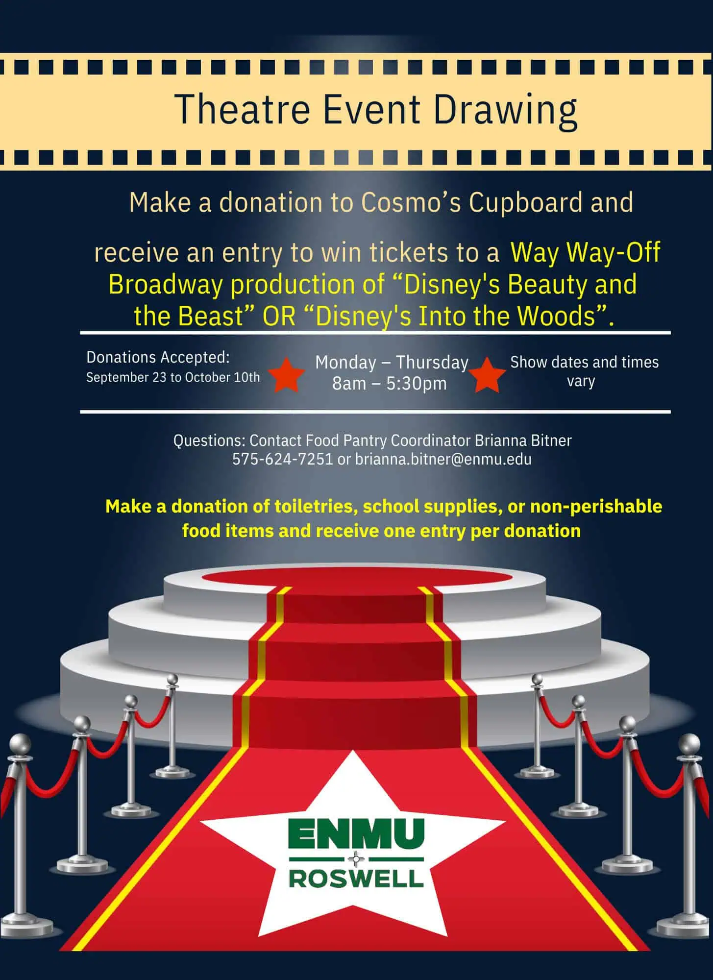 Make a donation to Cosmo’s Cupboard (food pantry) between September 23rd and October 10th, 2024, to receive an entry to win tickets to a Way Way-Off Broadway production of “Disney’s Beauty and the Beast” OR “Disney’s Into the Woods”. Toiletries, school supplies, and non-perishable food items are greatly appreciated. Donations will be accepted between 8:00 AM and 5:30 PM.