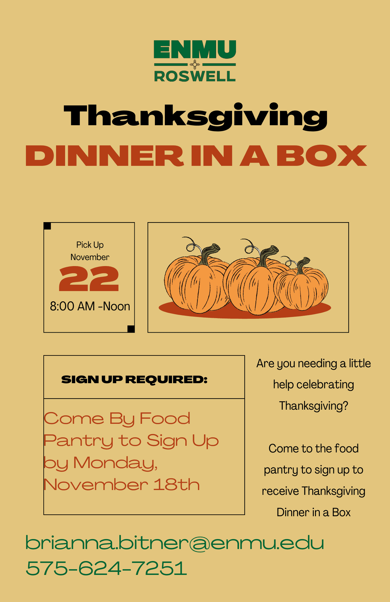 Are you needing a little help celebrating Thanksgiving this year? Come to the food pantry by Monday, November 18th, to sign up to receive Thanksgiving Dinner in a Box. Pickup will be on Friday, November 22nd between 8 AM and Noon.