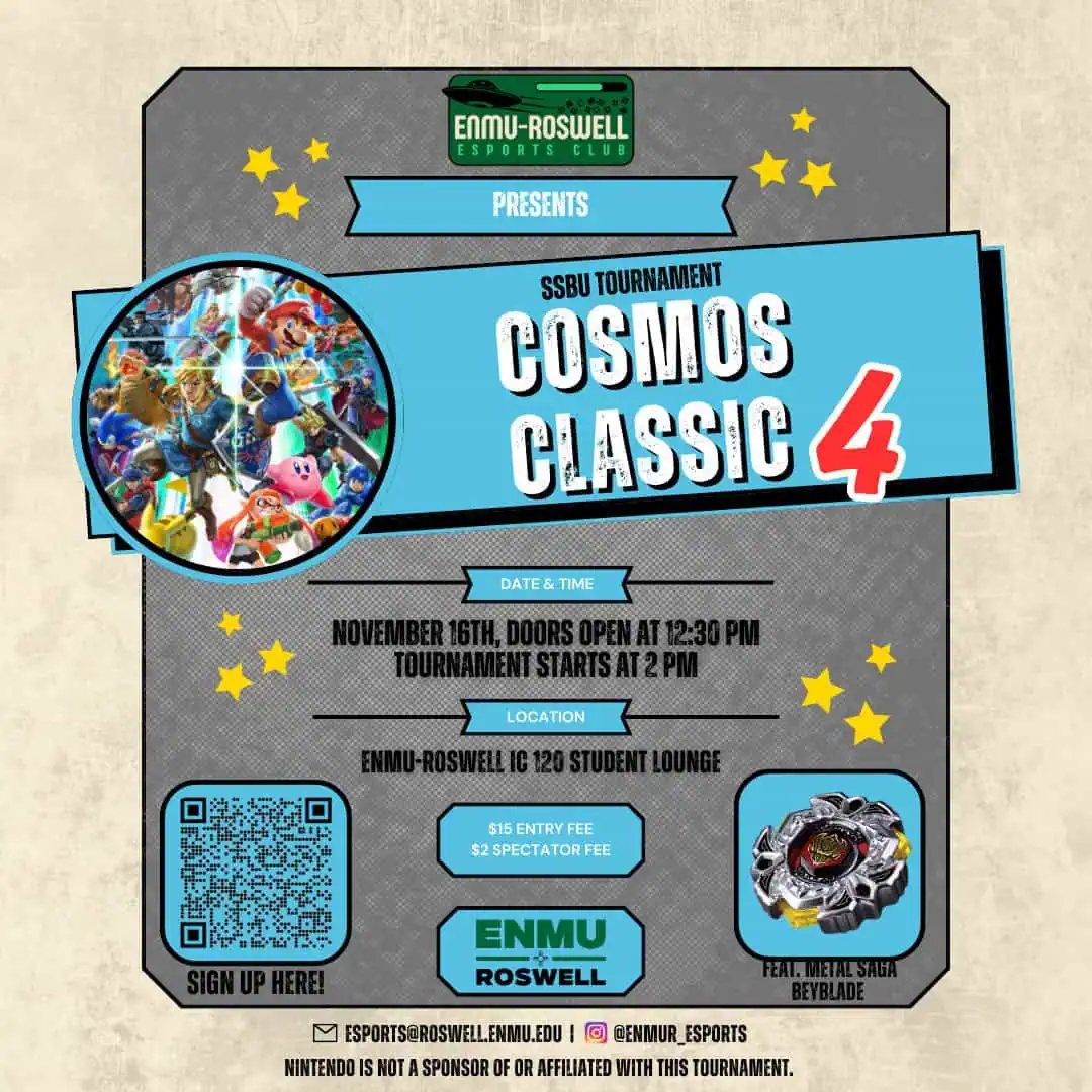 Join the ENMU-Roswell E-Sports Club on Saturday for a Super Smash Bros. Ultimate tournament — Cosmos Classic 4. The entry fee to play is $15 USD or $2 USD to participate as a spectator. Doors open at 12:30 PM and the tournament will begin at 2:00 PM. The tournament will be held in the student lounge.