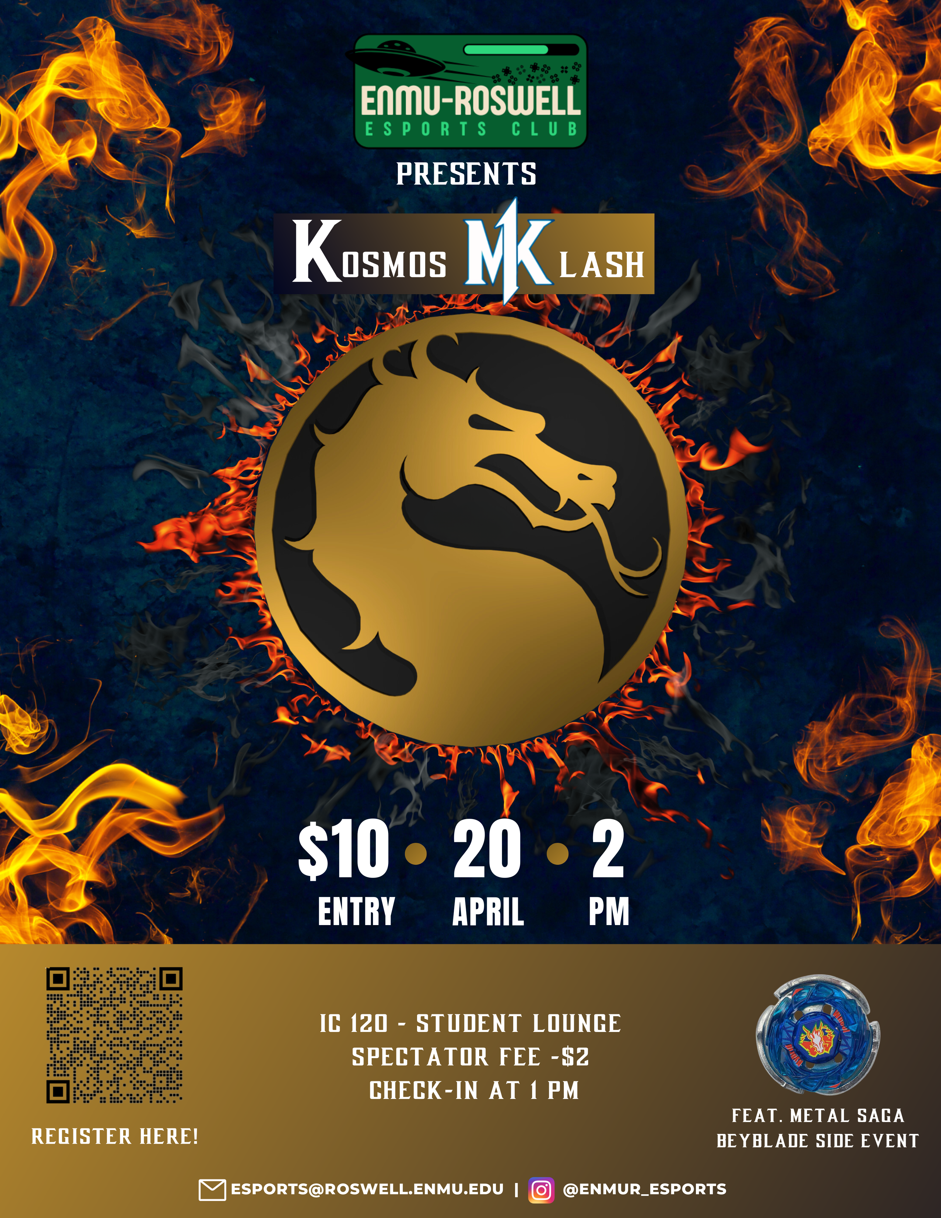 Join us on Saturday, April 20th, at 2:00 PM for our Mortal Kombat I Tournament that will be hosted in the Student Lounge. The entry fee is $10.00 USD to play and $2.00 USD to watch. Check-in will begin at .