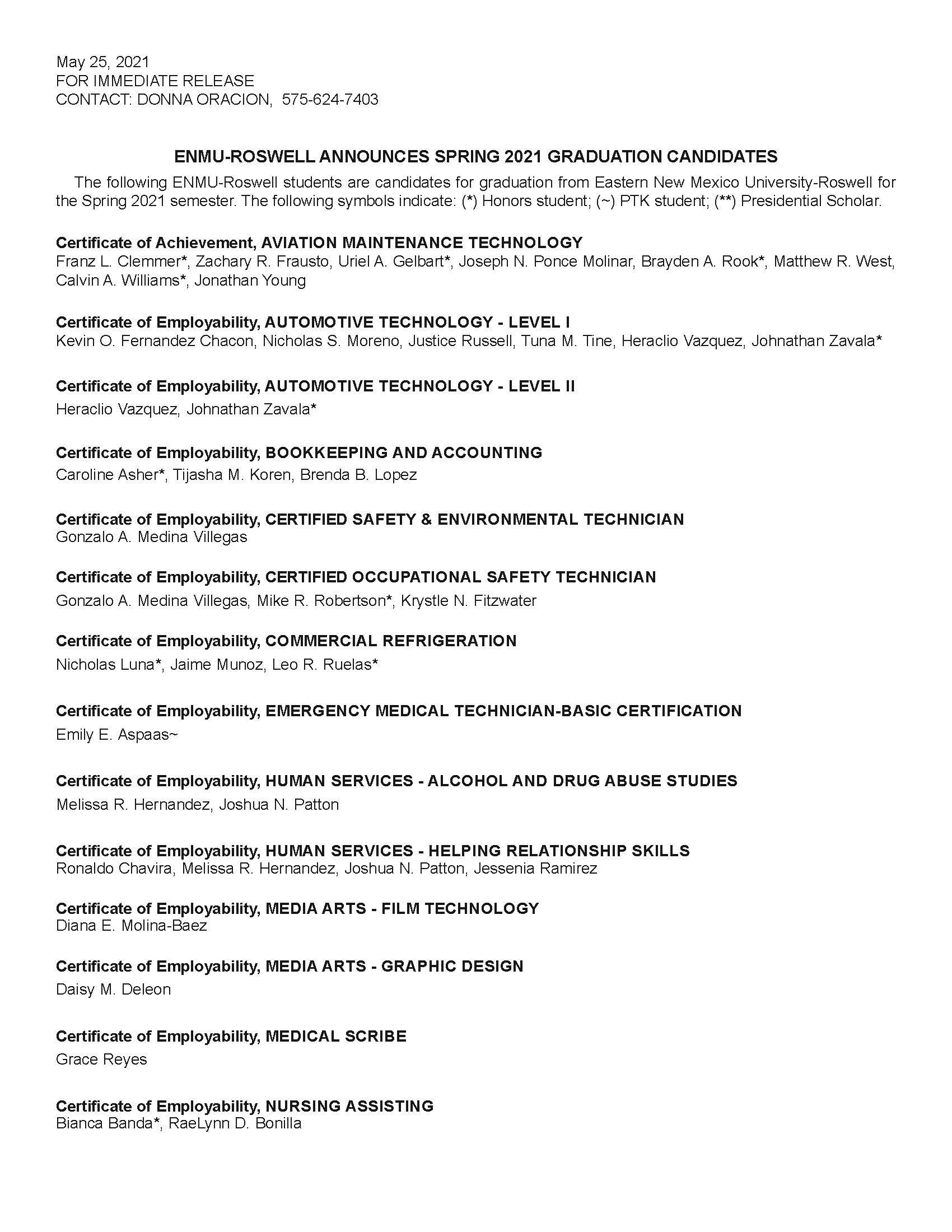 ENMU-Roswell Announces Spring 2021 Graduation Candidates