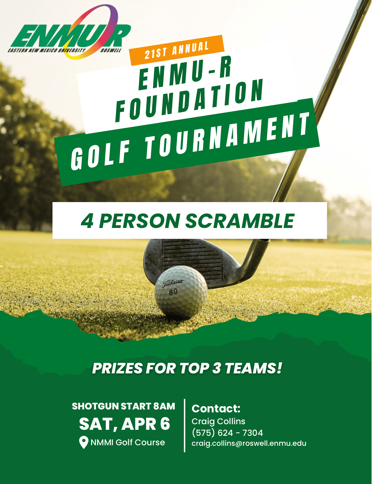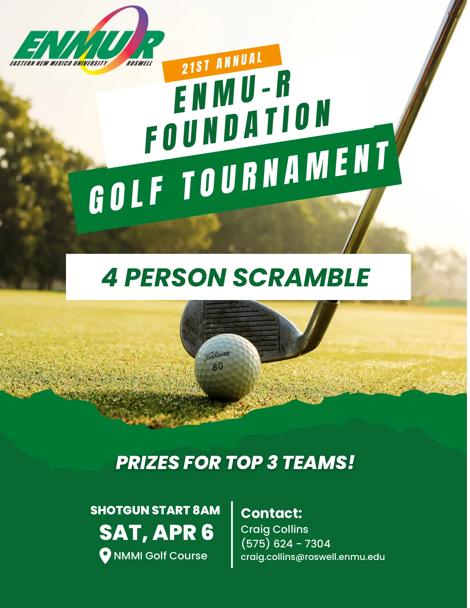 The ENMU-Roswell Foundation will host its Twenty-first Annual Golf Tournament on Saturday, April 6 at the New Mexico Military Institute Golf Course. Play will begin with a shotgun start at 8 a.m. Proceeds from the golf tournament will benefit the Foundation’s General Excellence Fund.