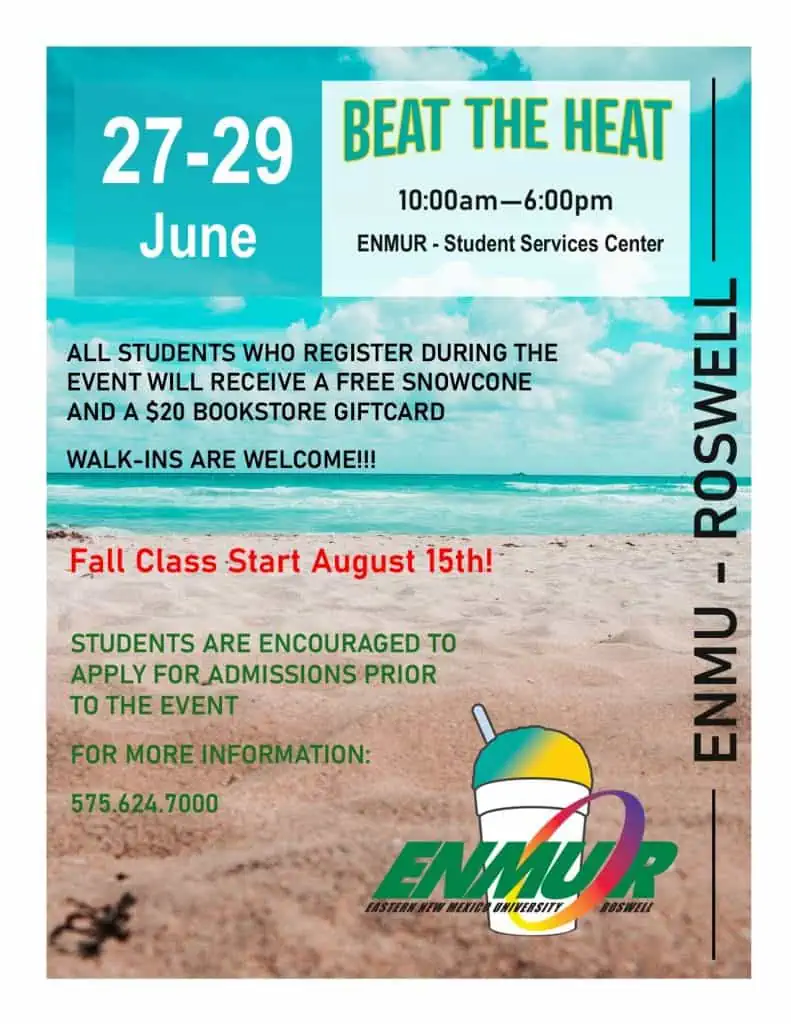 The ENMU-Roswell Student Services Center is hosting a ‘Beat the Heat’ 3-day registration event June 27-29. Students can stop in to the Student Services Center, 56 University Blvd., from 10 a.m. to 6 p.m. to register for the upcoming fall semester. Walk-ins are welcome. All students who register during the event will receive a free snow cone (from 10 a.m. to 4 p.m. each day) and a $20 gift card (while supplies last) for the ENMU-Roswell Bookstore.