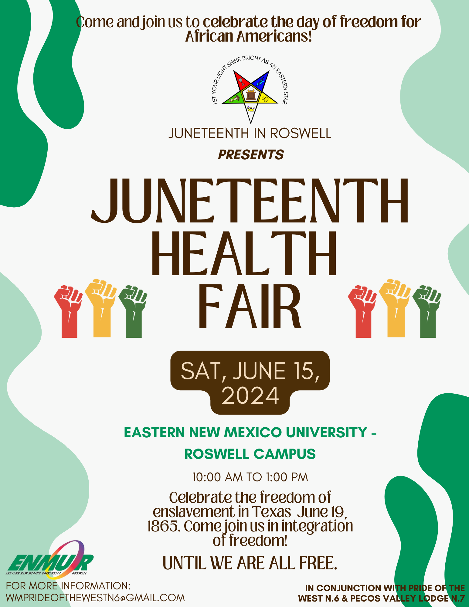 ROSWELL N.M. – May 29, 2024 – Eastern New Mexico University-Roswell (ENMU-Roswell) is proud to announce the celebration of Juneteenth with a special Juneteenth Health Fair on June 15, from 10 a.m. to 1 p.m. This event is being held in collaboration with Pride of the West N.6 and Pecos Valley Lodge N.7, aiming to unite the community in recognition of this important day.