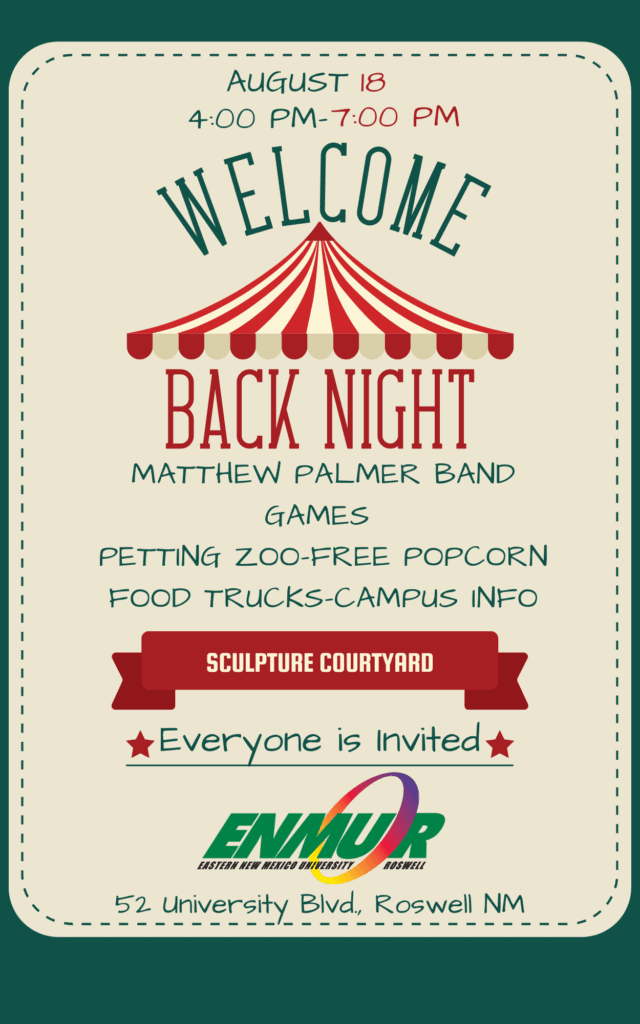 Students and community members are invited to attend a Welcome Back event at ENMU-Roswell on Thursday, August 18 from 4 p.m. to 7 p.m. in the sculpture courtyard outside the Performing Arts Center. The event will feature live music with the Matthew Palmer Band, games, free popcorn, and a petting zoo. Several food trucks will also be on site.