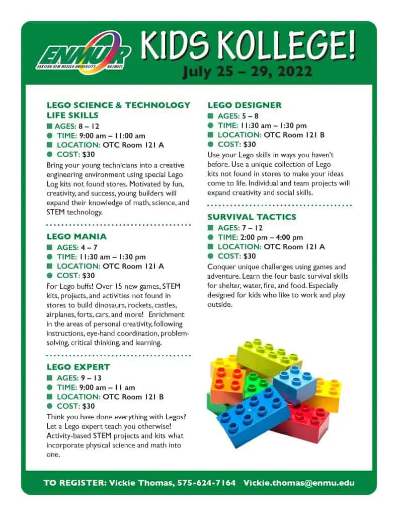 ENMU-Roswell invites students to register for Kids Kollege classes this summer. The Center for Workforce and Community Development (CWCD) will offer a variety of fun and educational classes for area youth July 25-29. Classes are designed for students ages 4 to 13, depending on the class. Cost for each class is $30. Pre-registration is required, as class sizes are limited. All classes will be held in the Lawrence C. Harris Occupational Technology Center (OTC) on campus at 20 W. Mathis St. To register or for more information, contact Vickie Thomas, CWCD Director, at 575-624-7164 or at [email protected]