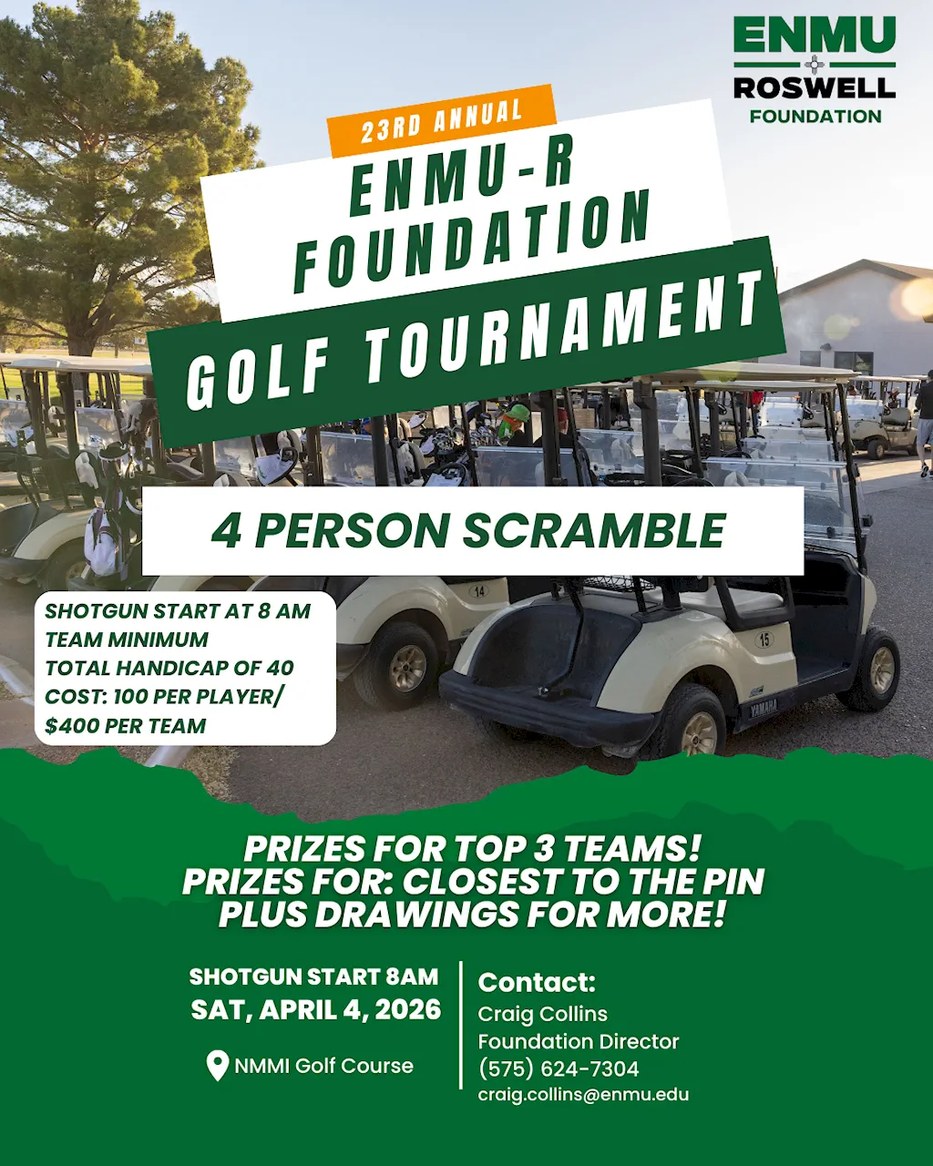 Join us on Saturday at the NMMI Golf Course for the 23rd Annual ENMU-Roswell Foundation Golf Tournament — 4 Person Scramble
