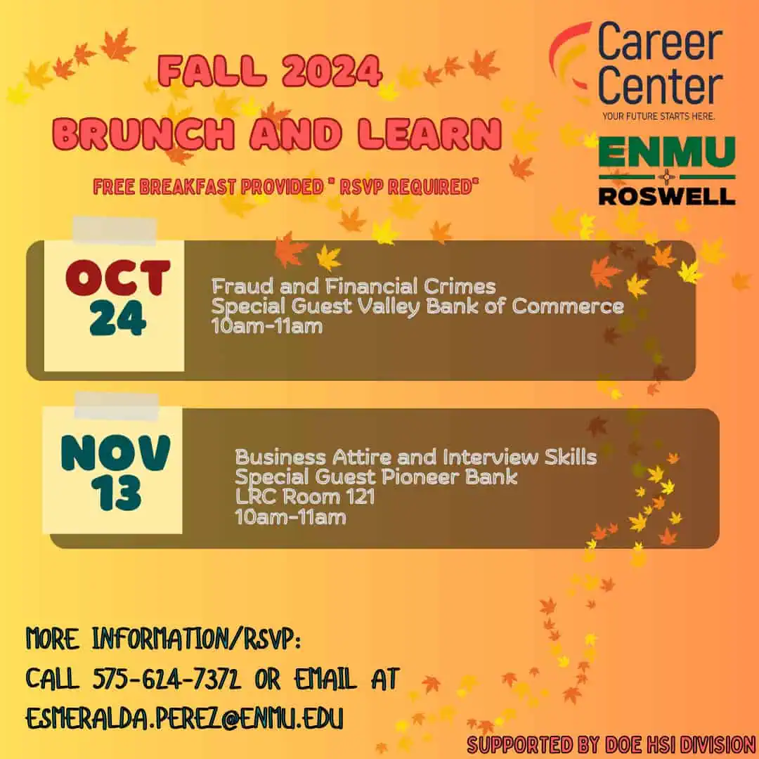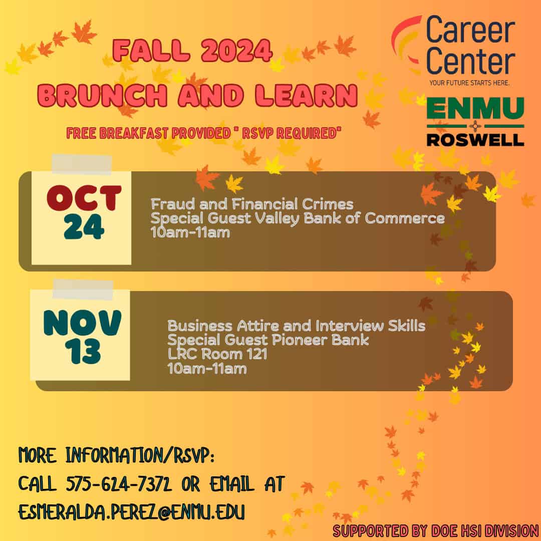 Join us in the Career Center this fall for two Brunch and Learn events. The first will take place on October 24th and will cover the topic of 'Fraud and Financial Crimes' with a special guest from Valley Bank of Commerce. The second event is schedule for November 13th and will cover the topics of business attire and interview skills.