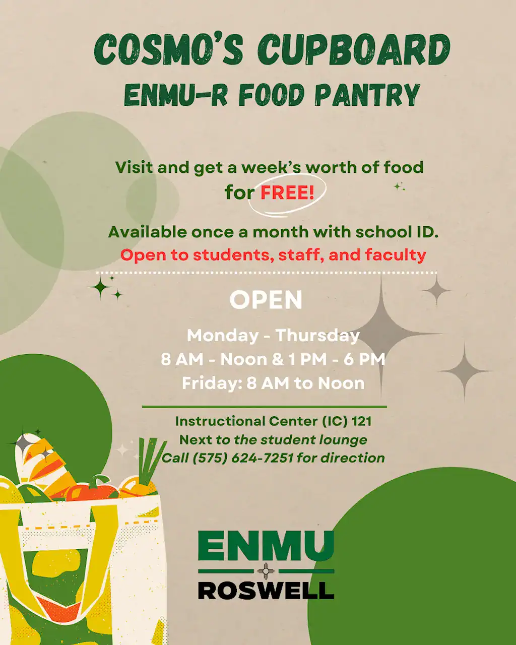 Any currently enrolled ENMU-Roswell student in need is encouraged to come by and pick up a week’s worth of non-perishable items, using their ENMU-Roswell Student ID.