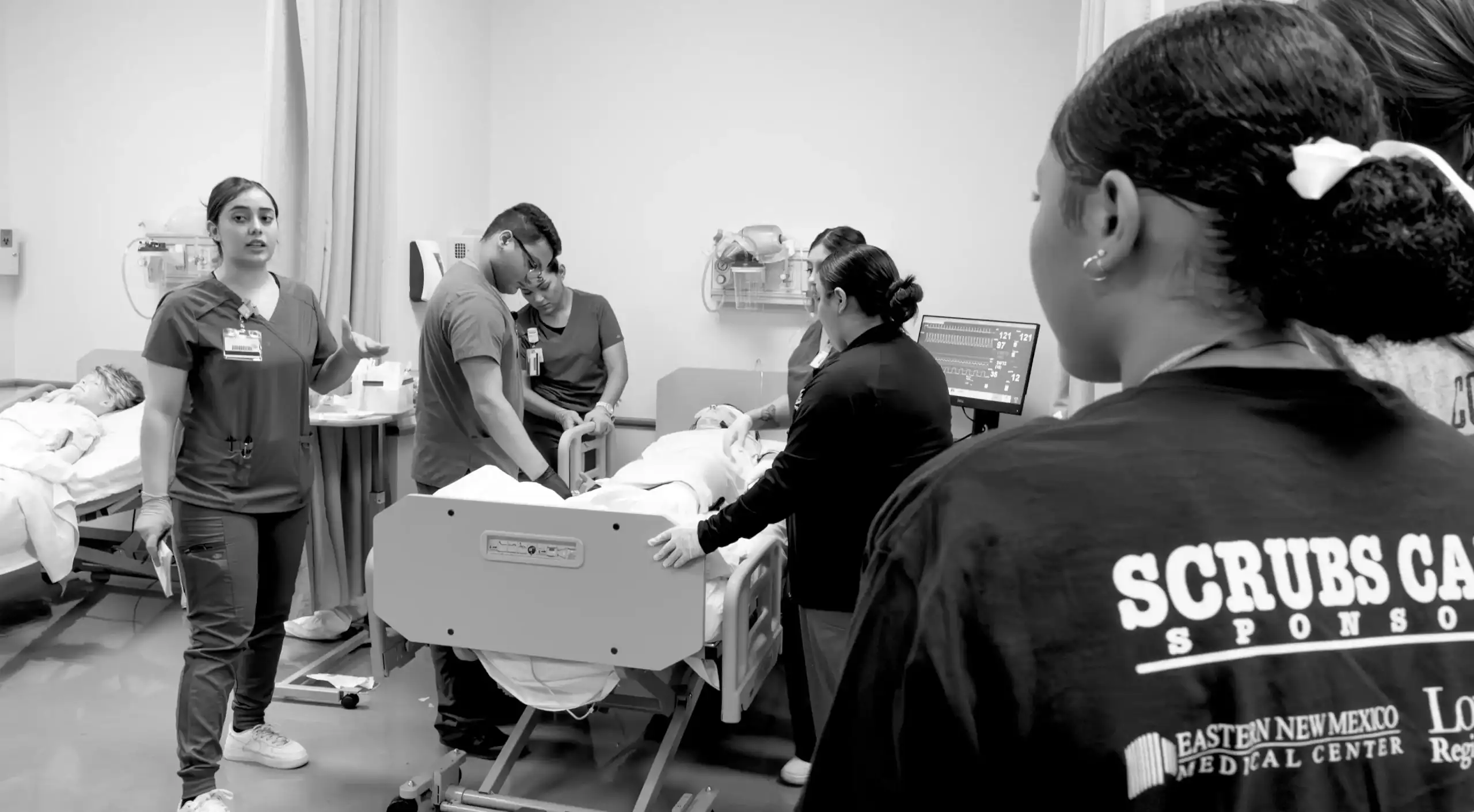 Students wearing "Scrubs Camp" branded blue t-shirts and teal medical scrubs gather around a hospital bed during a clinical simulation. A group of instructors in teal scrubs is demonstrating a procedure on a medical mannequin. The setting is a simulated hospital room, featuring a red medical utility cart with monitoring equipment, blue privacy curtains, and wall-mounted medical gas ports.