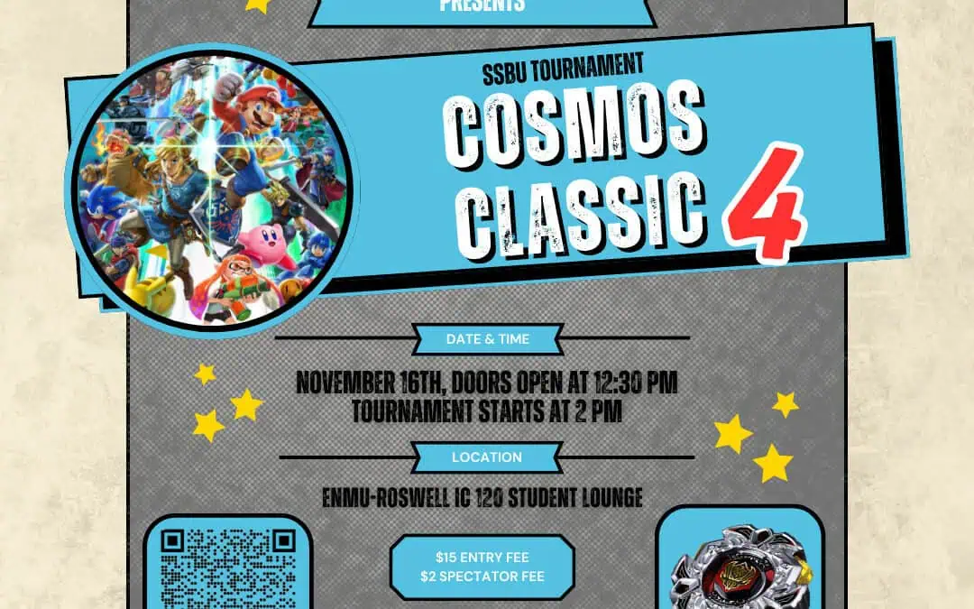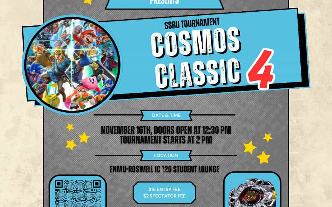 November 16th, 2024 @ 12:30 PM Student Lounge, IC 120 Join the ENMU-Roswell E-Sports Club on Saturday for a Super Smash Bros. Ultimate tournament — Cosmos Classic 4. The entry fee to play is $15 USD or $2 USD to participate as a spectator. Doors open at 12:30 PM and...