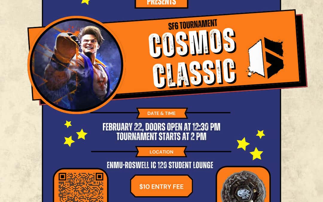 Cosmos Classic 7 Join the ENMU-Roswell E-Sports Club for an afternoon of competitive gameplay in the Student Lounge. Doors will open at 12:30 PM and the tournament starts at 2:00 PM. There is a $15 USD entry fee. See registration information for more details. For more...
