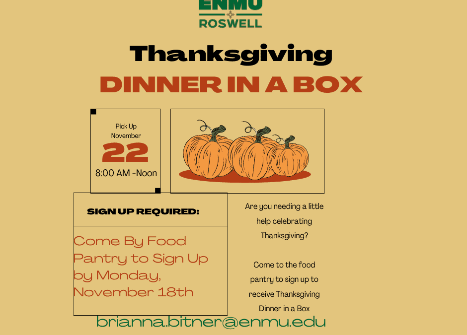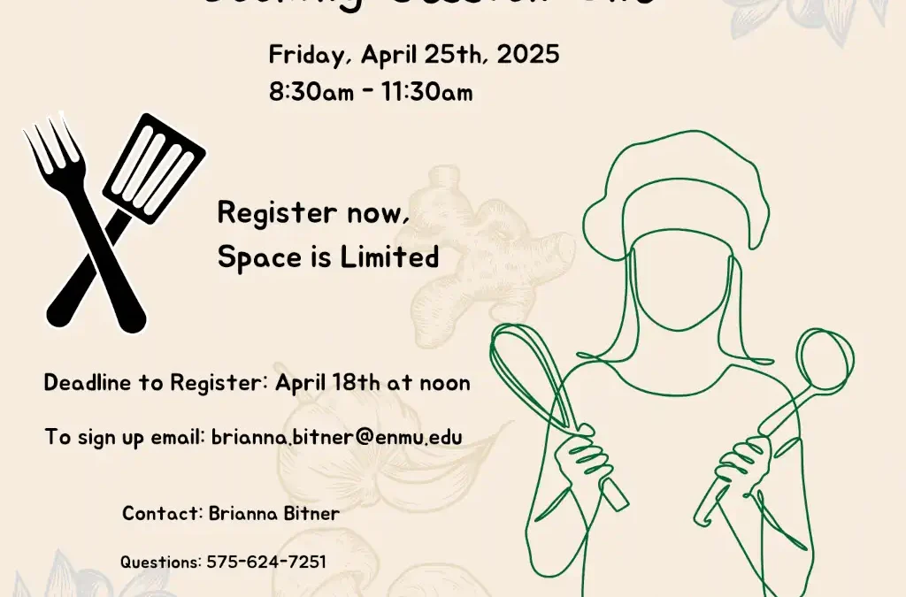 The ENMU-Roswell Food Pantry, Cosmo’s Cupboard, is hosting a cooking session for interested students. Space is limited and the deadline to register is April 18th at noon. To sign up, please contact Brianna Bitner via email at [email protected]. Information...