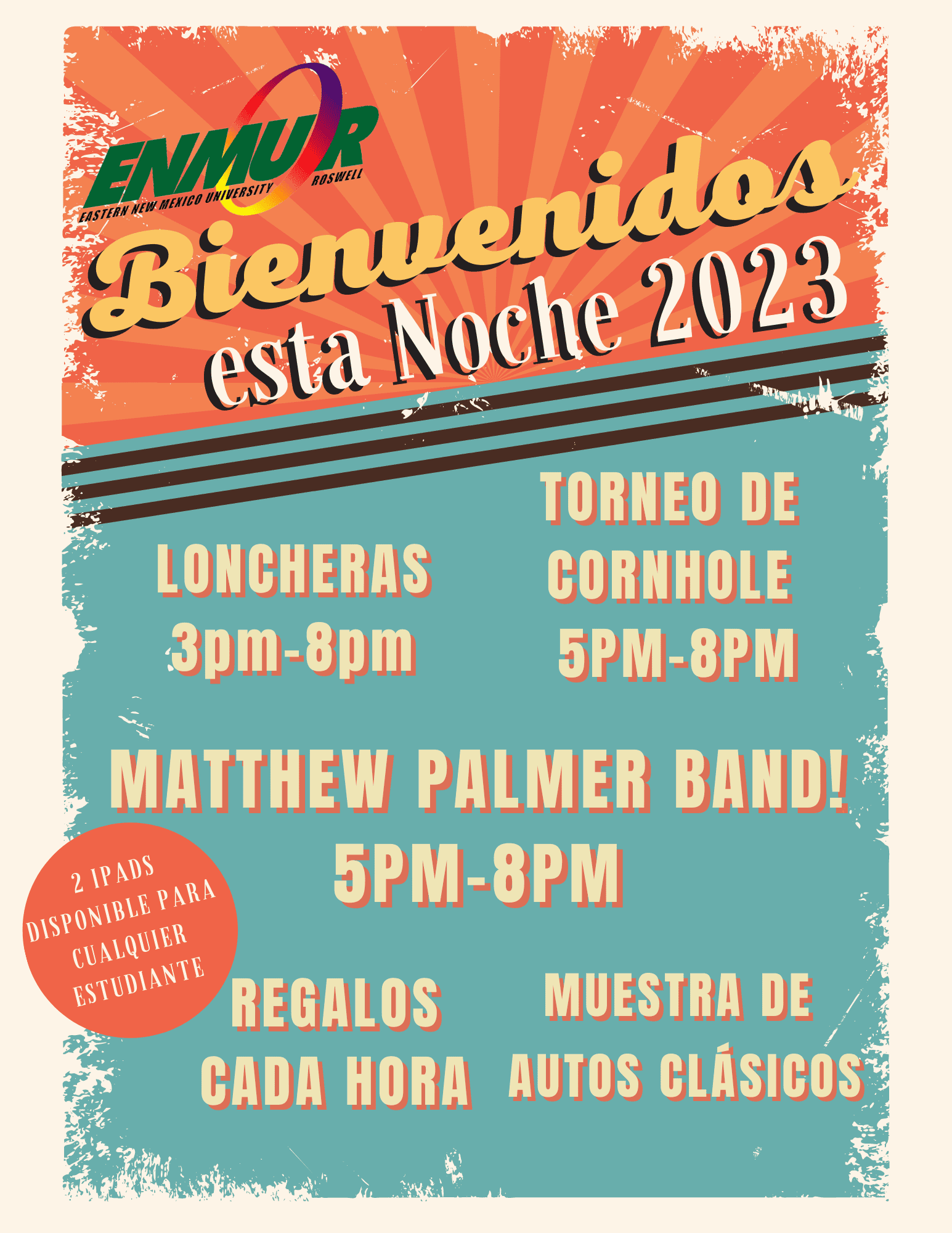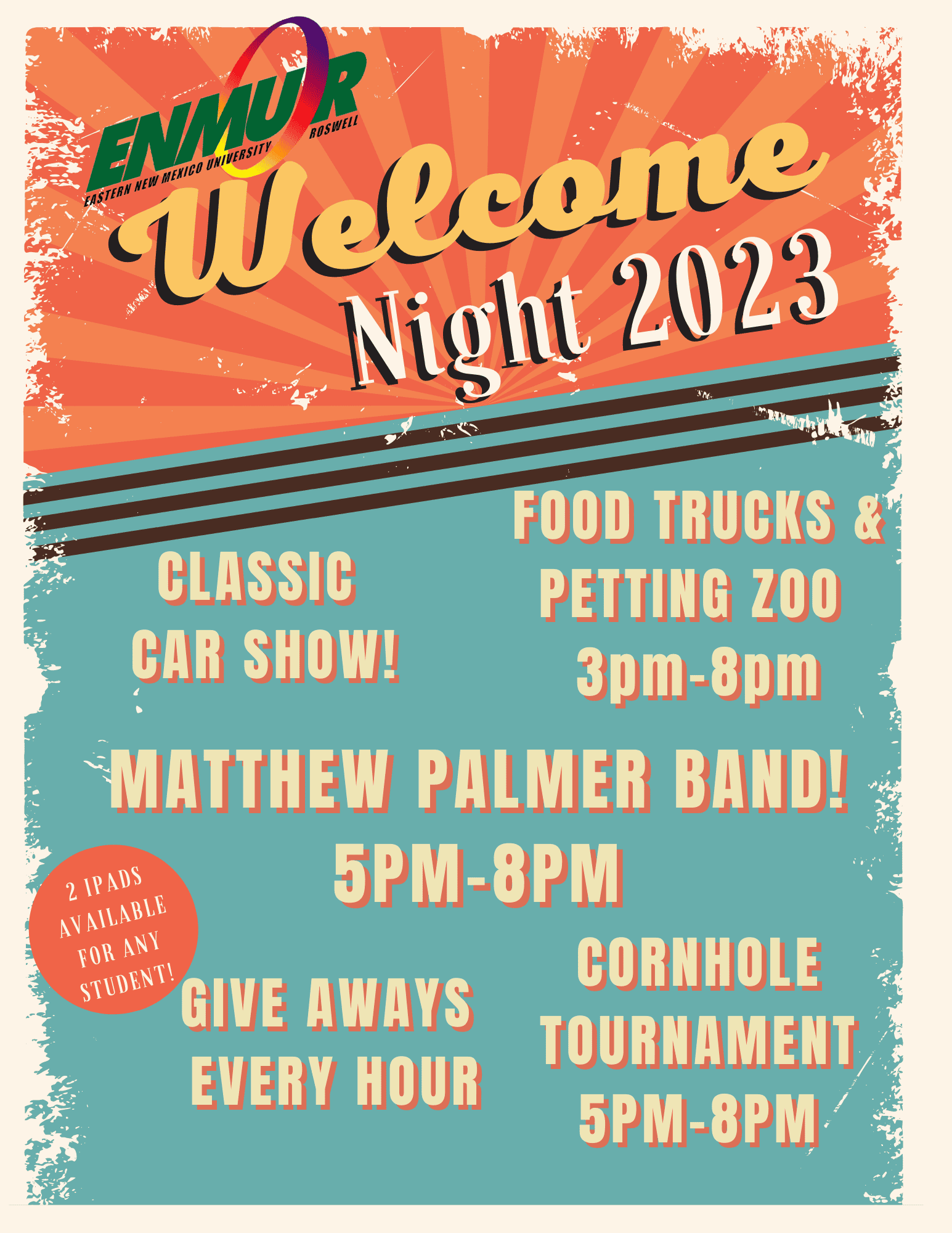 Welcome back to campus! We are hosting an event, Thursday, August 24th that will include food trucks, music, a petting zoo, games, giveaways, and a classic car show. Performing will be the Mathew Palmer Band. All are invited! The fun begins 3:00 PM and goes until 8:00 PM.